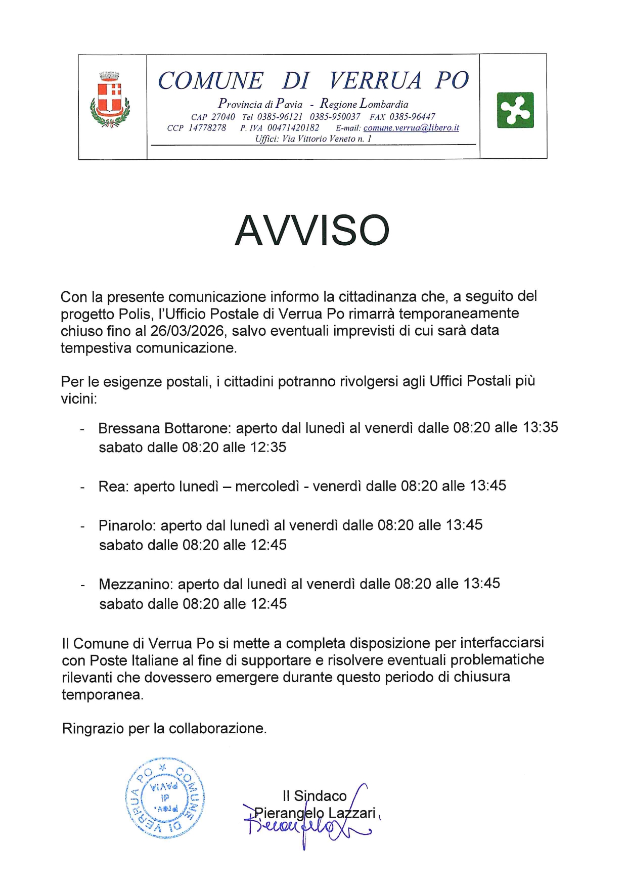 L'Ufficio Postale di Verrua Po resterà chiuso fino al 26.03.2026.